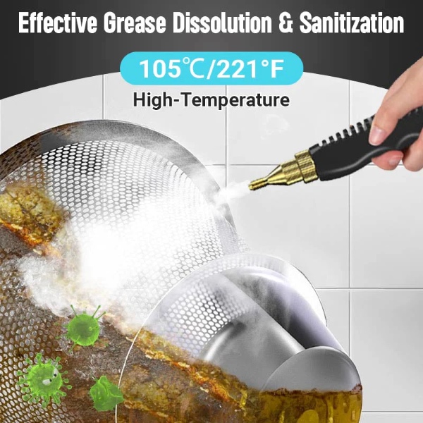 Jmenovitý výkon 2500W vytváří páru až 105℃ za méně než 10 sekund, což rychle odstraňuje mastnotu, špínu, prach a skvrny z různých povrchů.