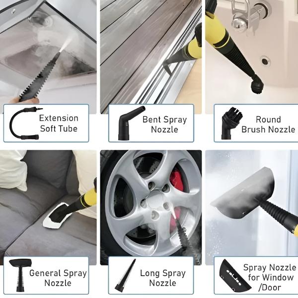 Obsahuje kartáče, trysky a podložky pro čištění podlah, spárovacích hmot, oken a dalších míst.