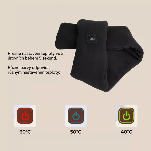 Zapojte šátek do přenosné nabíječky a stiskněte tlačítko – vyhřívání se okamžitě spustí. Pomocí třístupňového regulátoru snadno nastavíte teplotu tak, aby vám vyhovovala.