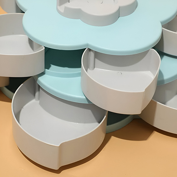 Dvouvrstvý úložný prostor, který se otevírá jako květina, usnadňuje organizaci kuchyně a šetří místo.